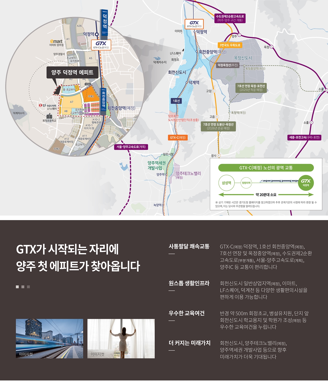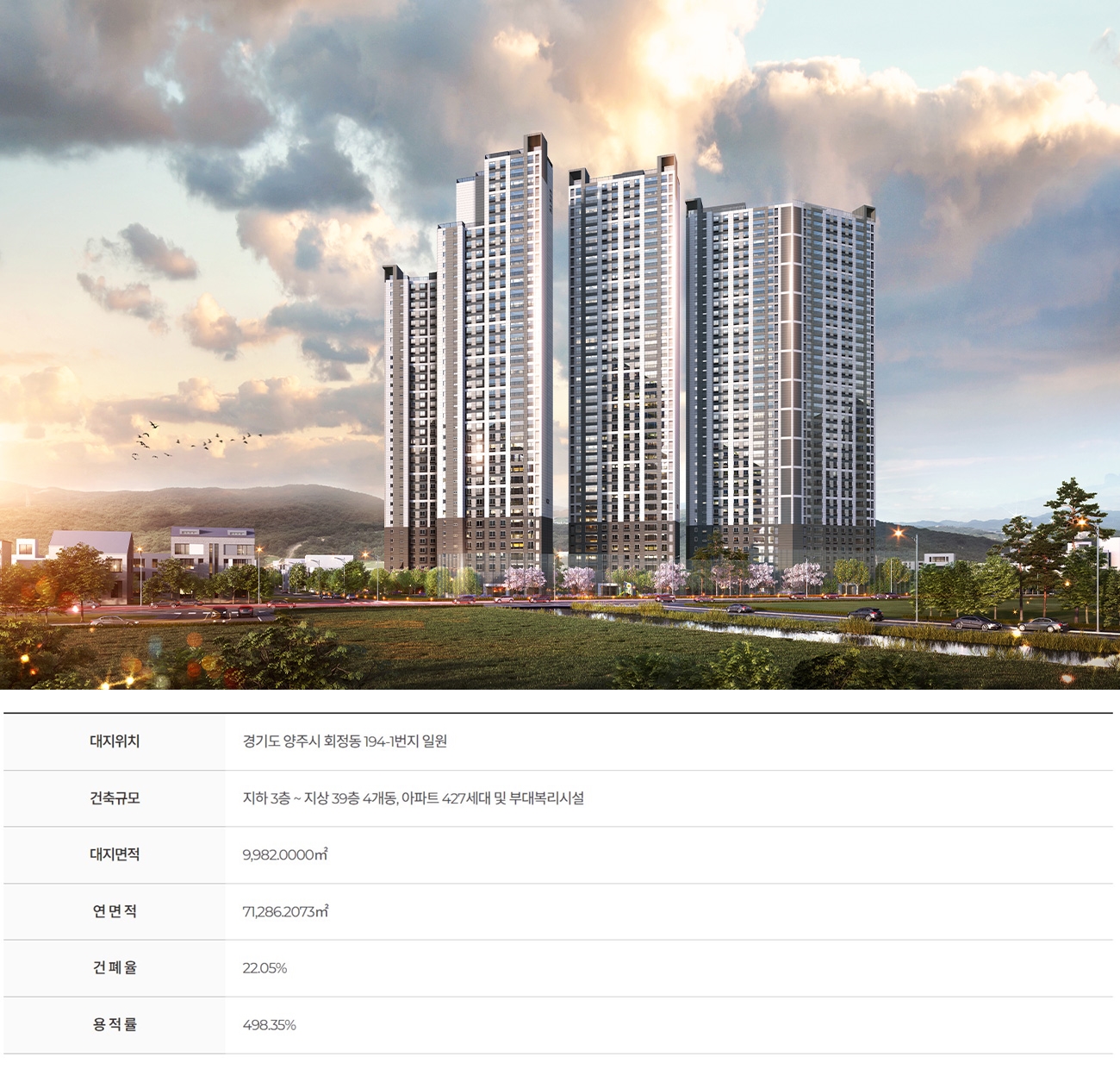 GTX C 노선 덕정역의 압도적 비전 서울 삼성역까지 20분대 연결되는 광역 교통의 중심 GTX C 노선의 기점인 덕정역 인근에 위치하여 강남권 접근성이 획기적으로 개선되는 교통 프리미엄을 선점합니다. 아이의 미래를 키우는 에듀 프리미엄 초등학교와 중학교를 도보로 누리는 안심 교육 환경 단지 주변에 위치한 학교 시설을 통해 어린 자녀의 안전한 통학과 우수한 교육 여건을 완벽히 갖추었습니다. 숲세권의 힐링을 품은 포레뷰 라이프 사계절 푸른 자연과 쾌적한 숲 조망의 여유 단지를 둘러싼 풍부한 녹지와 숲 조망권을 확보하여 도심 속에서도 자연의 싱그러움을 매일 경험하는 주거 환경을 제공합니다. 총 800여 세대 규모의 서희 브랜드 타운 양주를 대표하는 대단지 브랜드의 자부심 기존 서희스타힐스 시리즈와 함께 거대한 브랜드 타운을 형성하여 지역의 랜드마크로서 높은 인지도와 주거 가치를 형성합니다. 공간의 가치를 높이는 혁신 평면 설계 선호도 높은 4베이 판상형 중심의 쾌적한 내부 구성 채광과 통풍이 뛰어난 특화 설계를 적용하여 실사용 면적을 극대화하고 생활의 편리함을 더한 주거 공간을 완성합니다. 수도권 제2외곽순환도로 쾌속망 주요 도시를 빠르게 연결하는 광역 도로 네트워크 수도권 제2순환고속도로와 세종포천고속도로 등을 통해 서울 및 인접 대도시로의 차량 이동이 매우 편리합니다. 양주 회천신도시의 인프라 공유 신도시의 풍부한 생활 편의를 모두 누리는 주거 중심 인접한 회천신도시의 다양한 쇼핑, 문화, 행정 서비스 인프라를 입주 즉시 편리하게 이용 가능한 생활권입니다.